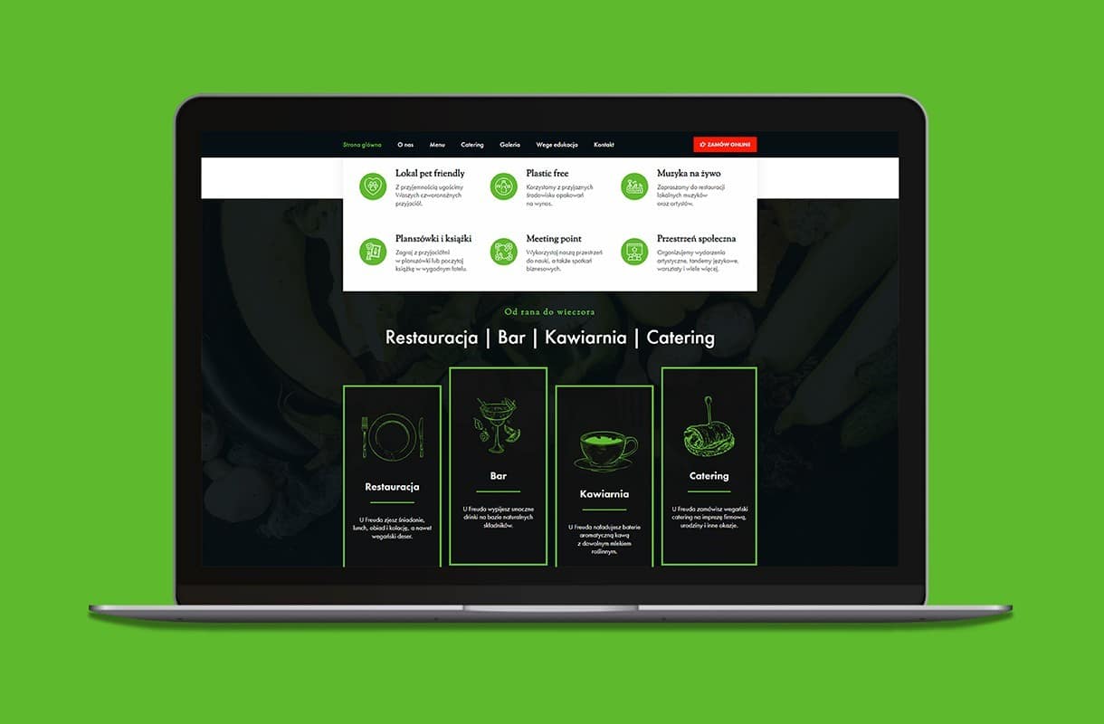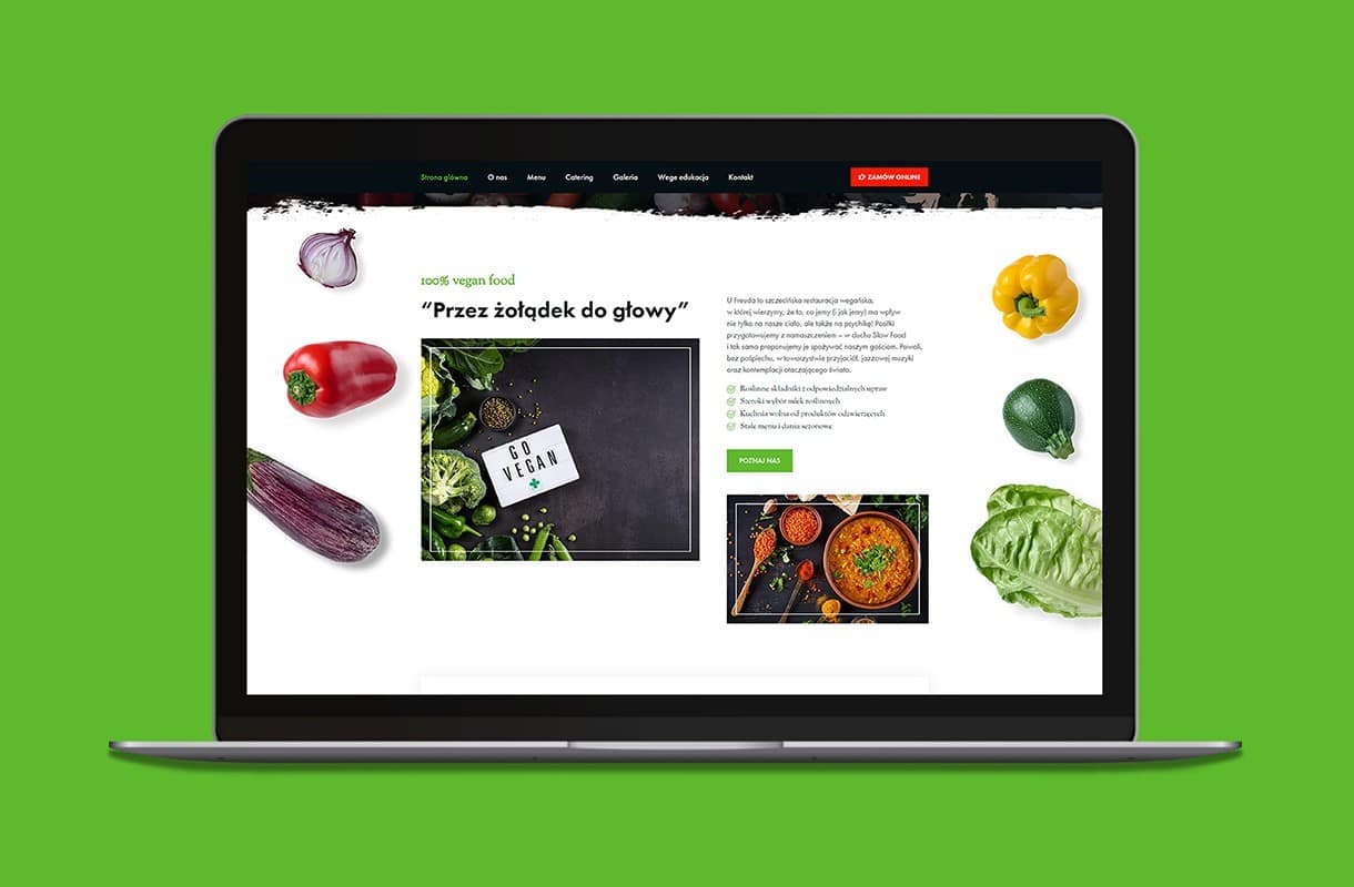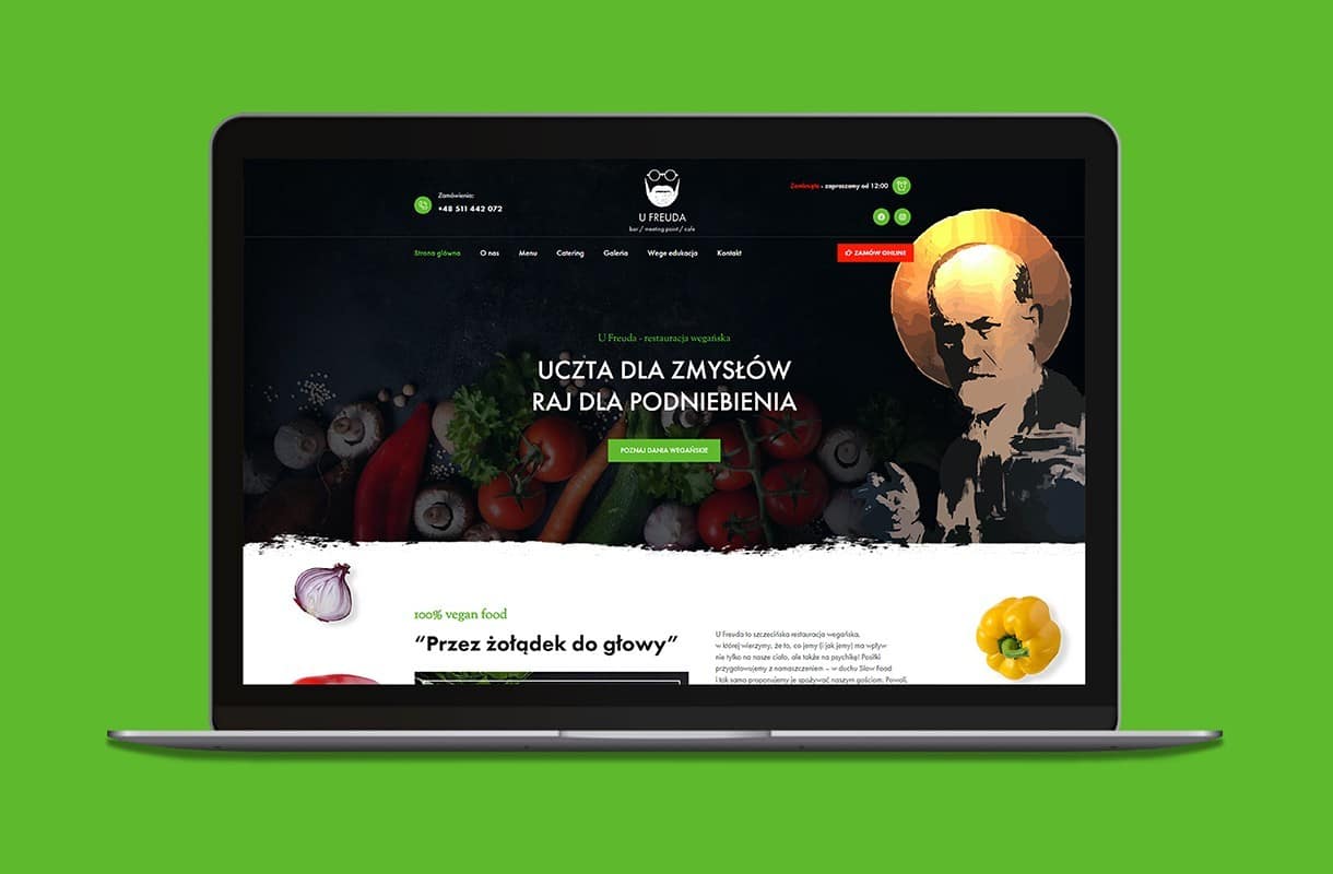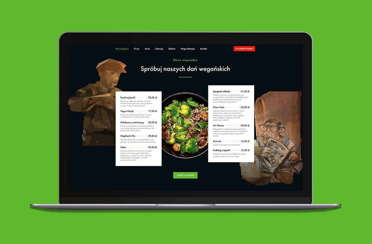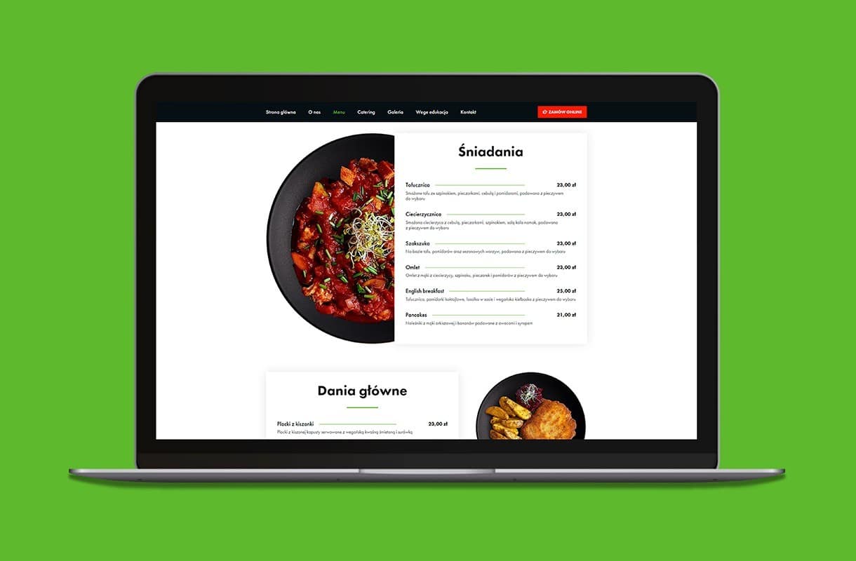 When creating the website for this vegan restaurant, we decided to play with contrasts. White and black combined with colourful accents fit into the style of the restaurant. Numerous CTA buttons encourage to interact with the website, and the “Vege Edukacja” tab allows visitors to learn more about the vegan diet. The mobile version of the website works fast and invites the users to place orders online, as well as to book a table via the form. The menu has been enriched with original photos – so that one can’t resist tasting the proposed delicacies!