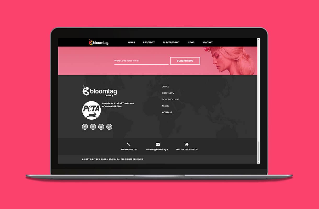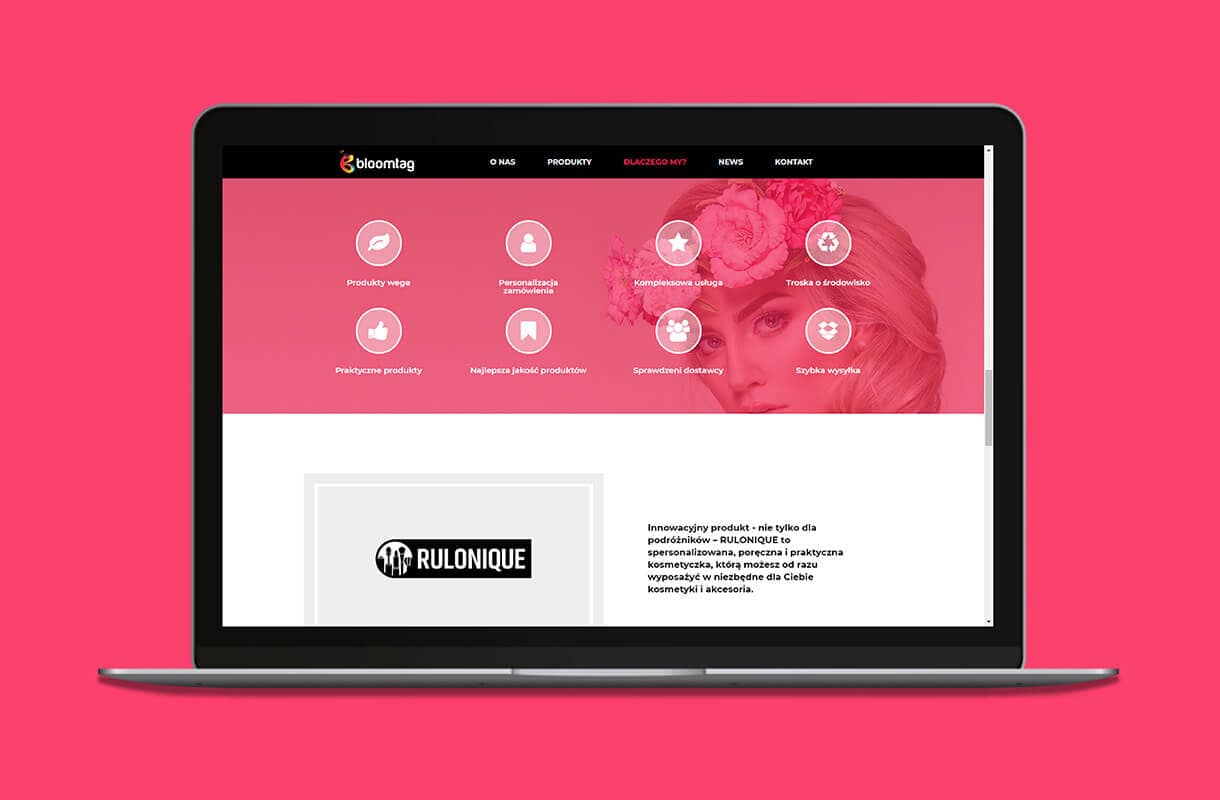 Przy opracowaniu projektu dla Bloom Sp. z o. o. zadbaliśmy o pełną identyfikację wizualną. Stworzyliśmy dwujęzyczną stronę internetową z funkcją sklepu oraz złożone, a zarazem zgrabne i przyjemne w odbiorze logo. Strona www utrzymana jest w nowoczesnej estetyce, zawiera m. in. opisy produktów, opis firmy, aktualności. Pomimo wielu elementów zachowuje lekkość i wdzięk. Zastosowaliśmy najnowsze technologie, dzięki temu strona działa płynnie, szybko się ładuje i dostosowuje do wszystkich typów urządzeń.