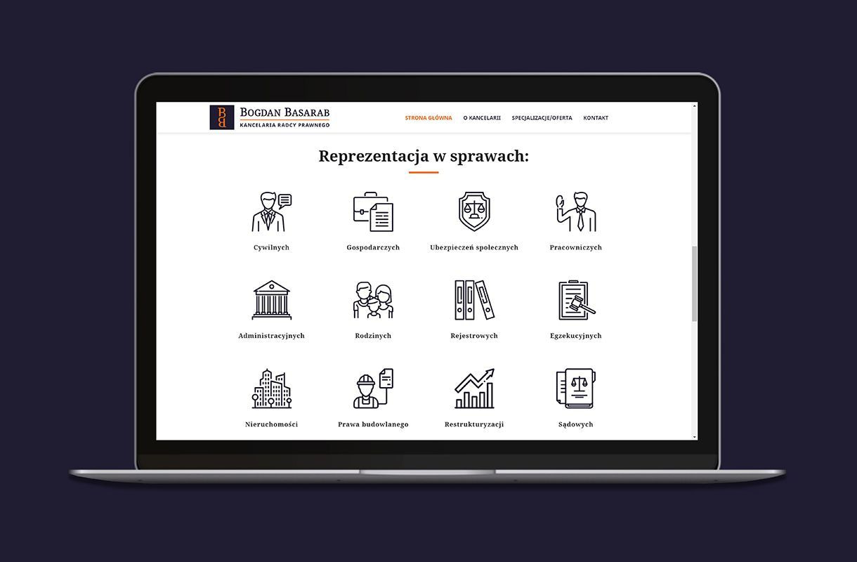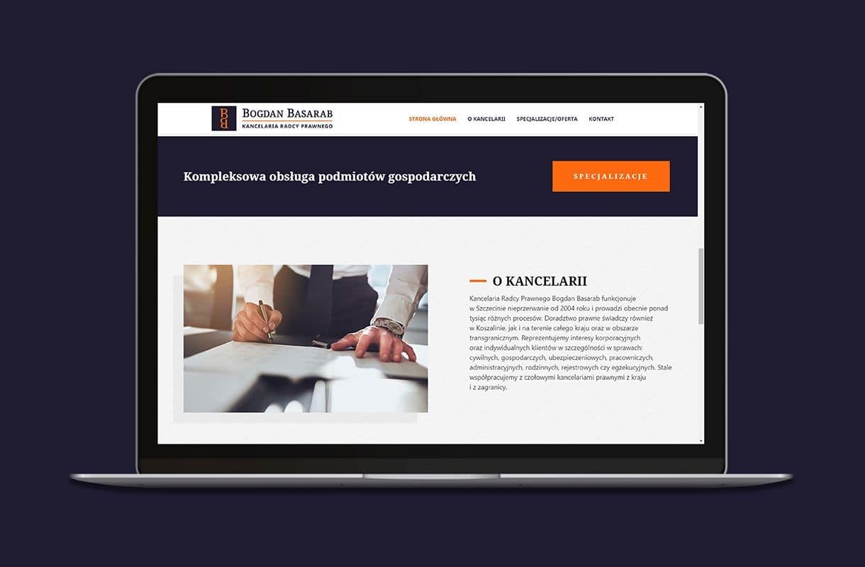Stroną dla kancelarii Basarab zbudowaliśmy z wizji profesjonalizmu i modernizmu. Specjalnie dobrana kolorystyka – połączenie eleganckiego granatu wraz z pomarańczową charyzmą, przedstawia obraz Radcy Prawnego najwyższej klasy. Na stronie zastosowaliśmy moduły wideo, które zamieszczone są w sekcjach reklamowych. Dostosowana jest do urządzeń mobilnych oraz UX (user experience).